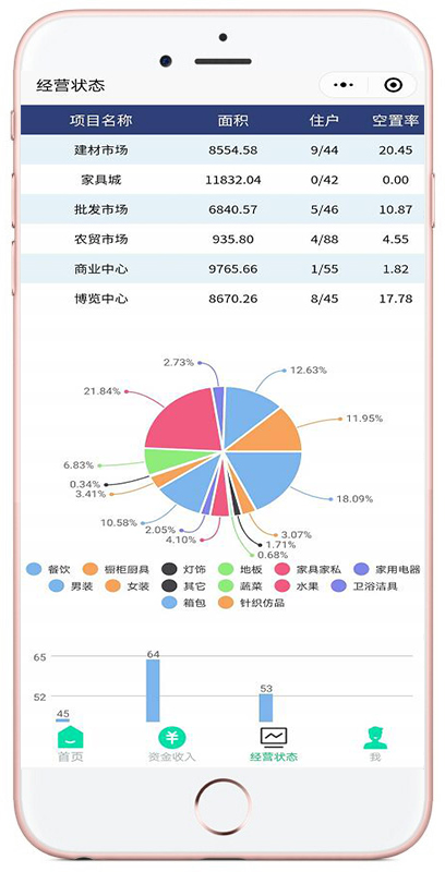 領導(老板)可(ke)以(yi)通過該模塊查詢每個(ge)項(xiang)目的面積數(shu)(shu)、住(zhu)戶數(shu)(shu)、空置(zhi)率情(qing)況,還可(ke)以(yi)通過圖例(li)方(fang)式直觀地統計顯示各項(xiang)目的經營(ying)業態分布、資產用途等情(qing)況。
