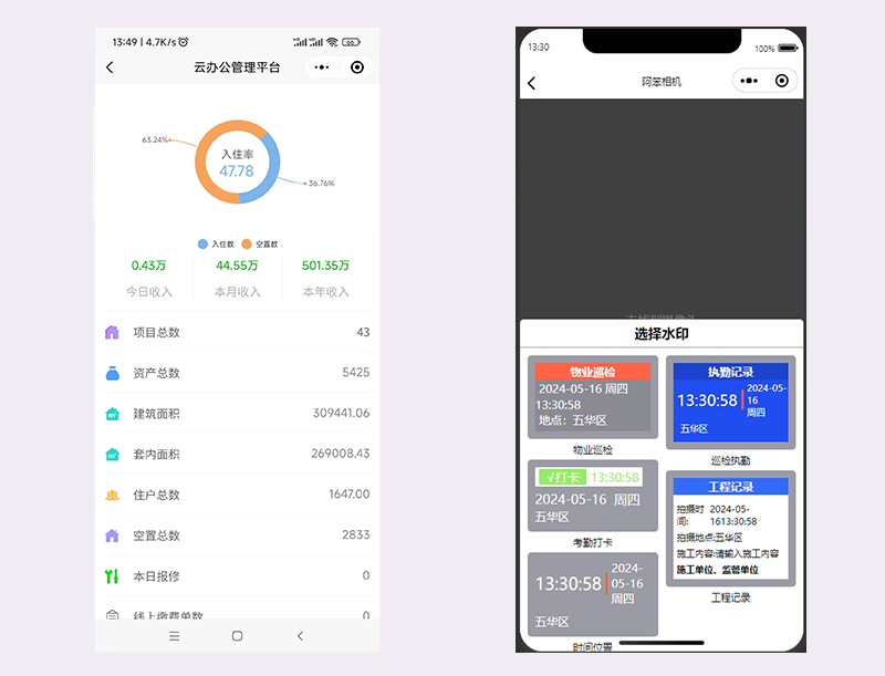云辦公管理(li)平臺(tai)主(zhu)要有(you)數據匯(hui)總、領(ling)導審批、資產圖(tu)表(biao)、資金(jin)圖(tu)表(biao)、收支流水賬、銀(yin)行日(ri)記(ji)賬、資產查(cha)(cha)詢(xun)、住戶查(cha)(cha)詢(xun)、到期合同、到期費(fei)(fei)用、欠費(fei)(fei)住戶、現場收費(fei)(fei)、臨時收費(fei)(fei)、人工抄表(biao)、設(she)備巡查(cha)(cha)、空房巡查(cha)(cha)、報修工單(dan)、訪(fang)客登(deng)記(ji)、裝修工單(dan)、異常事(shi)項(xiang)、跟進(jin)管理(li)、獎懲登(deng)記(ji)、電子巡更等功能。